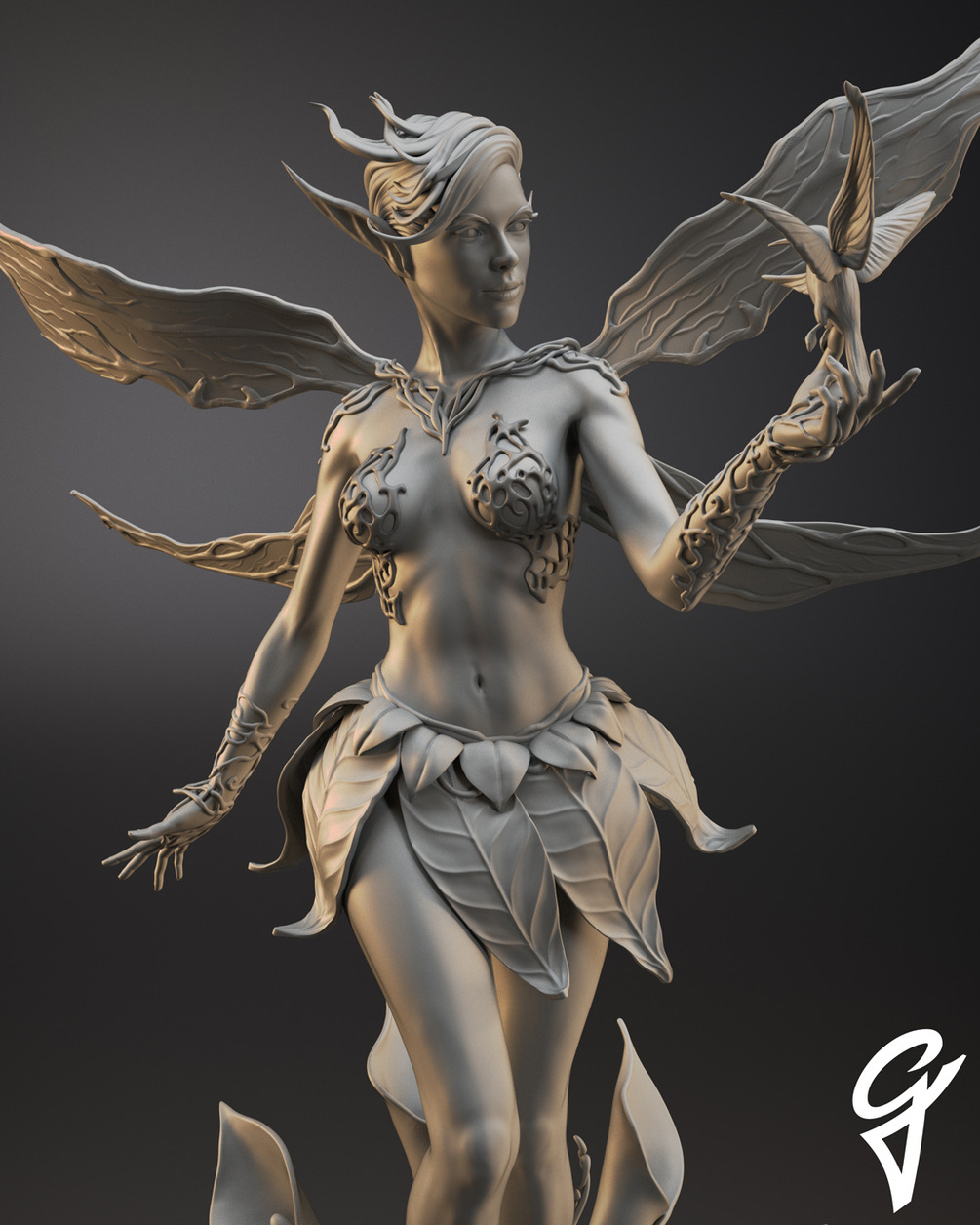 Inspired by a character from a game named Paragon, here is Ibila. This beautiful fairy is flying over flowers while communicating with her little friend.